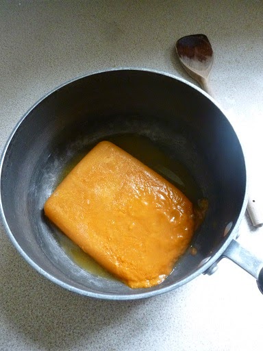 | Frozen soup. In a pan. |