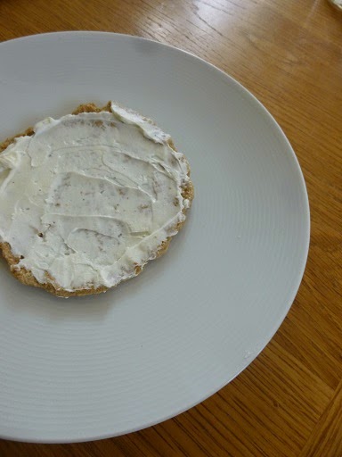 I did however manage to get a couple of oat flatbread balls out of the fridge in the morning, so they’d be room temperature by lunch time. They were less sticky now, and I managed to roll them out between two sheets of greaseproof paper before cooking them in a frying pan and spreading them with almost all the remaining yogurt cream cheese.