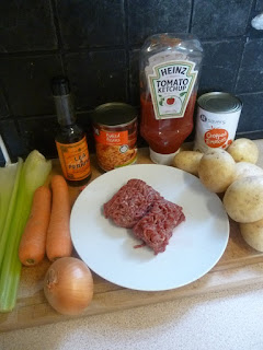 | Ingredients for cottage pie, plus little bits of oil, milk and butter. |