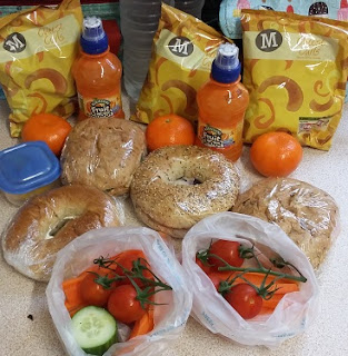 I resurrected some of yellow-stickered cut-price bagels from the freezer, and bunged in assorted combinations of soft cheese, ham and stilton depending on preference. I also raided multi pack crisps and drinks, chucked in cucumber, tomatoes, carrot sticks and satsumas in a nod to health, and added a little blue box of sliced peach for my satsuma-disliking daughter.
