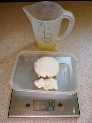 As you can see, the 300g of natural yogurt ended up as 125g soft cheese, plus an additional 150ml or so of whey, which Ceri reliably informs us can used for things like soaking porridge oats or whole grains to make them more digestible.