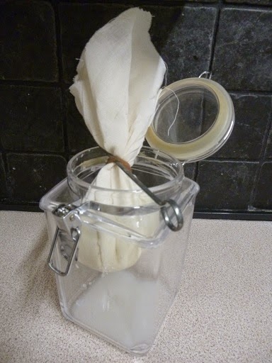 I transferred the cheese into a plastic box and used a knife to scrape off any remaining cheese from the muslin.