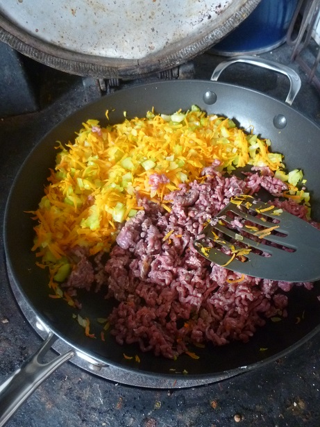 4. When the veg have softened, push them to one side of the frying pan and add the mince.