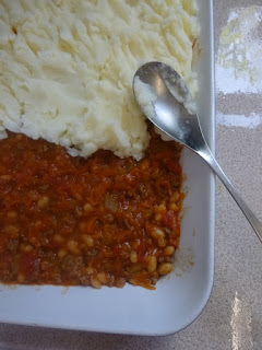8. Once the mince mixture has thickened, tip it into a big dish. To give you an idea, mine is a pottery dish about 25cm by 32cm. Splodge spoonfuls of mashed potato on the top, to cover the mince.