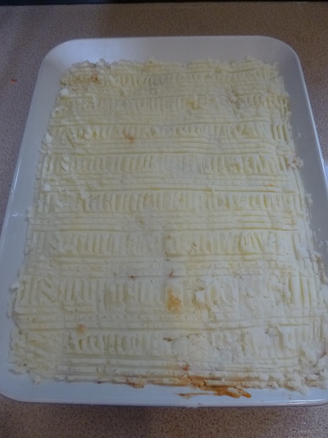 9. Use a knife to smooth out the top of the mashed potato. I also used a fork to draw lines on the top, to make it less obvious where the mash is different levels. Brush a bit of milk (only a tablespoon or so) over the top, to help the pie go brown in the oven.