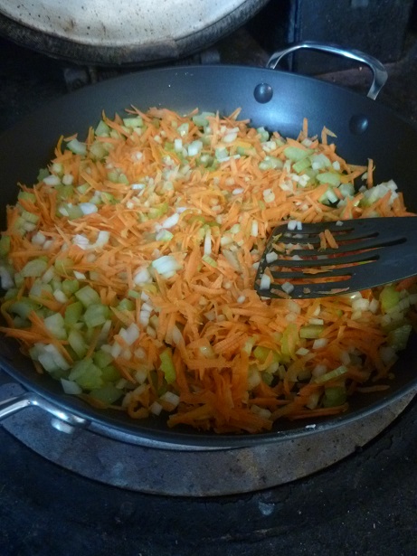 2. Heat a tablespoon of oil in a frying pan, add the celery, carrot and onion, and cook gently until they soften.