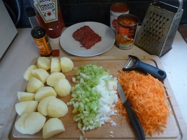 | Ingredients for cottage pie, plus little bits of oil, milk and butter. |