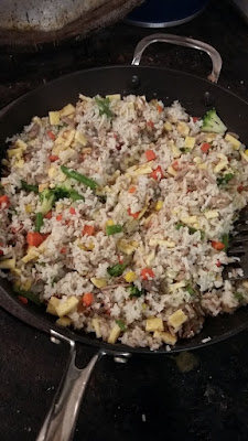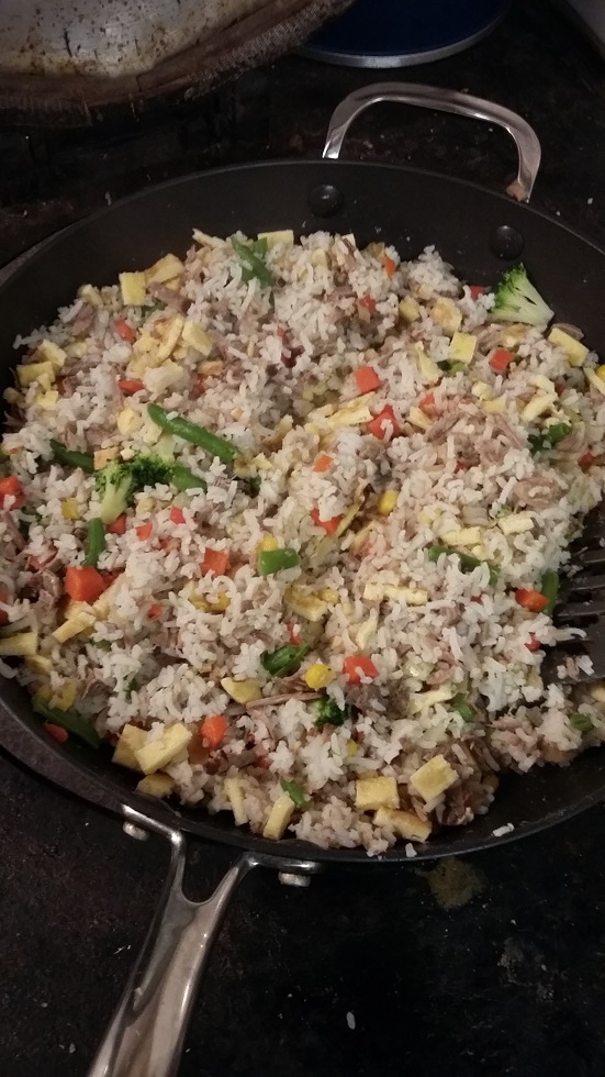 Industrial quantities of egg-fried rice, using leftover roast beef