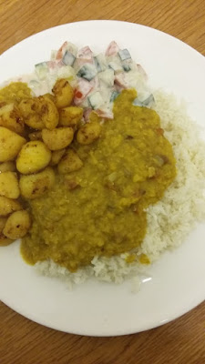dahl, bombay potatoes and cucumber & tomato raita