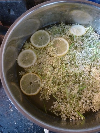 4.When the syrup is boiling, take it off the heat, then dump in the lemon, citric acid and elderflower heads and stir. Put a tea towel over the pan or put the lid on, and leave it at room temperature for 24 hours.