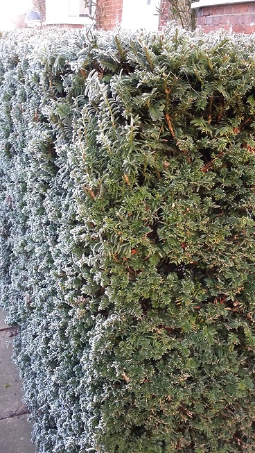 | Now you see it, now you don’t – only frost on the front of the yew hedge. |