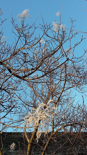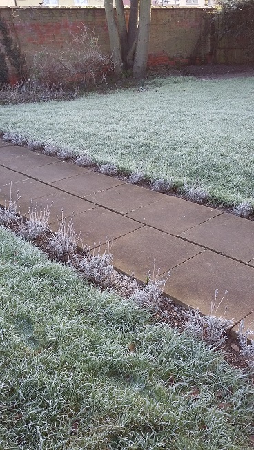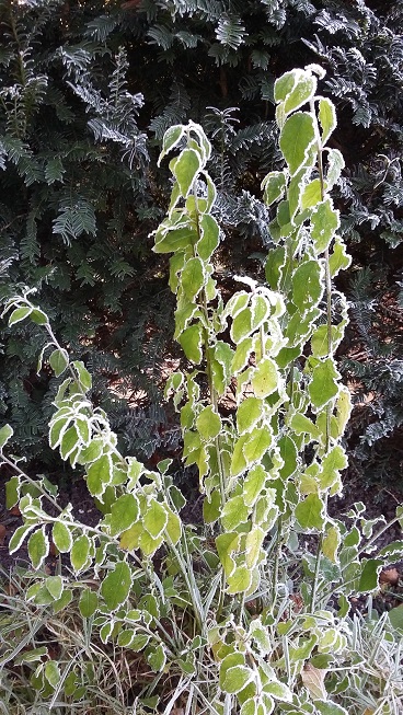 Much of our garden is quite sheltered, thanks to the boundary wall, but the back of the house takes the brunt of the wind and weather rushing up the hill. Frost on one of the yew hedges showed how one side was frozen, whereas the other side was left almost untouched.