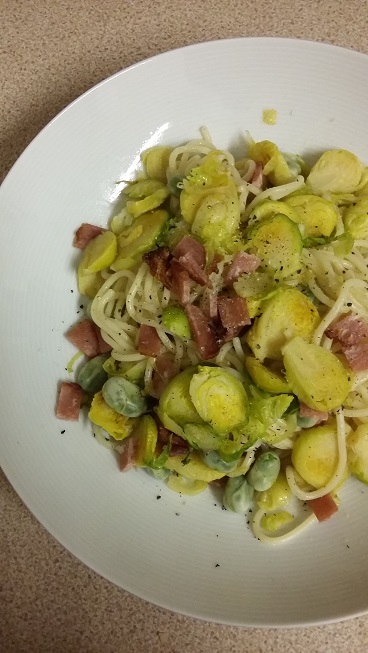 | Broad beans, brussel sprouts and bacon – good. With spaghetti? Less so. |