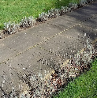 Fired with enthusiasm in the spring sunshine I also got round to trimming and tidying up the lavender beds either side of the front path, and my husband mowed the front lawn last night. This morning the rooks, pigeons and blackbirds were having a field day, pecking out worms from the newly-shorn grass.