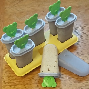 I used three yellow-stickered bananas, and the teddy bear lolly moulds I found in a charity shop last year, so it cost all of 15p for six lollies and an extra helping.