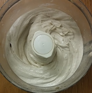 Then get them out of the freezer for a few minutes so they’re not rock hard, whizz with a food processor or stick blender till it looks like Mr Whippy (hang on in there, it takes longer than you might expect).