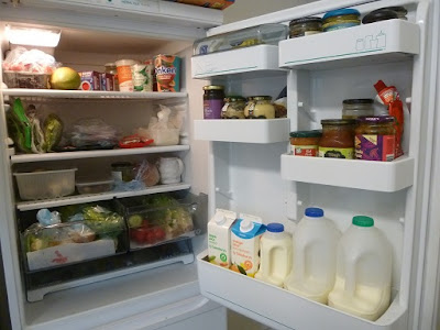 It’s mostly drinks, plus any extra leftovers and veg that won’t fit in the big fridge. There’s even some yogurt cheese in process on the shelf above the veg drawer.