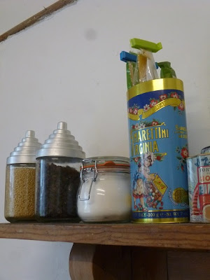 The top almost unreachable shelves have dried stuff like lentils, split peas and nuts on the left and fancy baking stuff on the right. Cake sprinkles and cooking chocolate are stashed in the silver tin, in a an attempt to stop the younger generation mountaineering up the worktop in search of sweets.