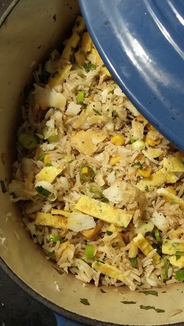 Afterwards, take the lid off, and use a couple of works to flake the fish into chunks and mix it in with the rice. Add the omelette, spring onions and coriander, stir round a bit and serve with a lemon chunk to squeeze over the top.