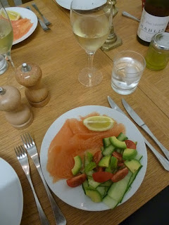 In the end we ate smoked salmon with a salad of cucumber, avocado and tomato: