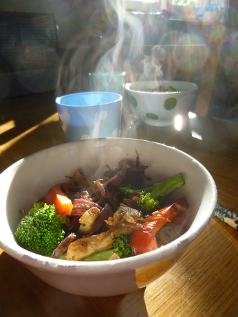 Lunch: Leftover stalks and leaves soup (recipe here), with a ham and soft cheese sandwich