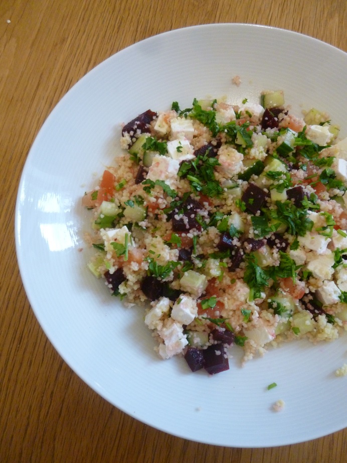 Lunch: Feta, beetroot and artichoke hearts with cous cous