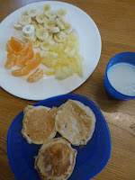 Breakfast: Pancakes with banana, satsuma and tinned pineapple, or porridge with banana.